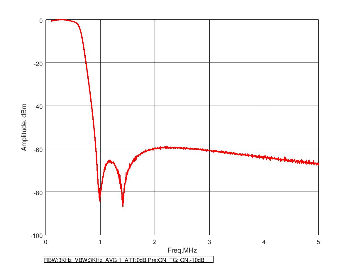 Here is the transfer function of said filter, as measured on my spectrum analyser. Insertion loss is around 0.4dB, and stopband attenuation is about 60dB. Attenuation of the second and third harmonics is better than 75dB. I think this will do the job nicely.