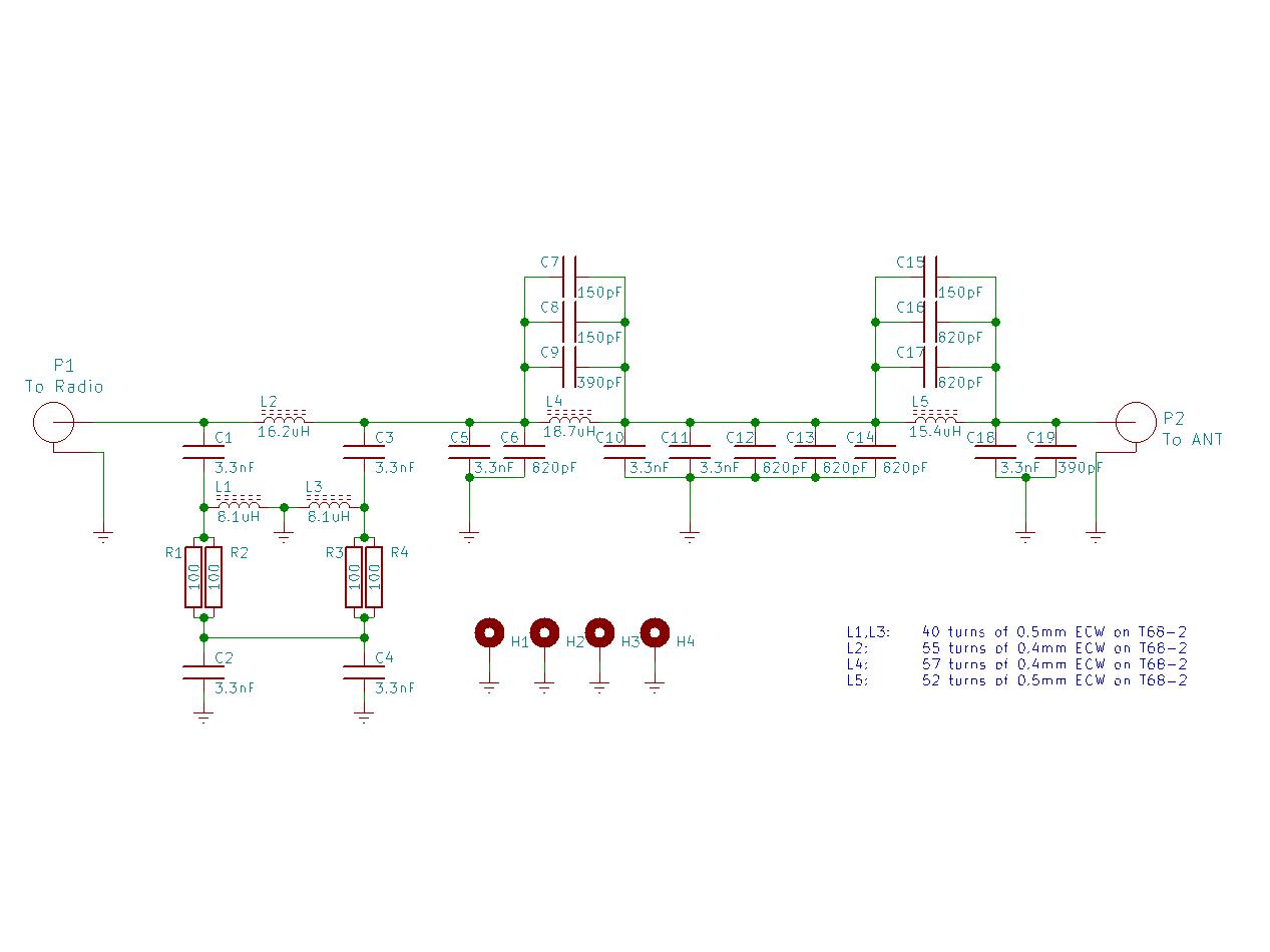 The first job is to clean up the IC-7300 transmit RF, before any amplification. The best way to to do this is with a low pass filter. This one is nothing special - just a 5-pole Cauer (Useful Links) filter, with the added benefit of a 1-pole absorptive filter section. The schematic of the filter is shown right.