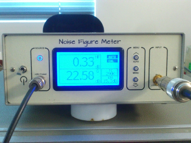 I have been fortunate enough to be able to borrow a HP8970A (thanks Steph - you know who you are), and a commercial noise source from work. This has allowed some comparison measurements to be made. The photos below show the same nf measured. Clearly a lucky happenstance. Repeated tests are showing my meter to be within 0.1dB of the HP8790A. This in no way represents the accuracy of my measurement - only that it is repeatable, and within 0.1dB of a commercial PANFI. Nonetheless, I am happy with the result.