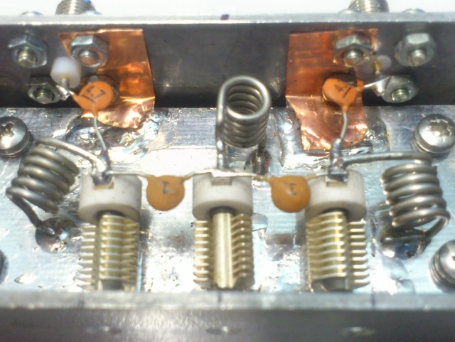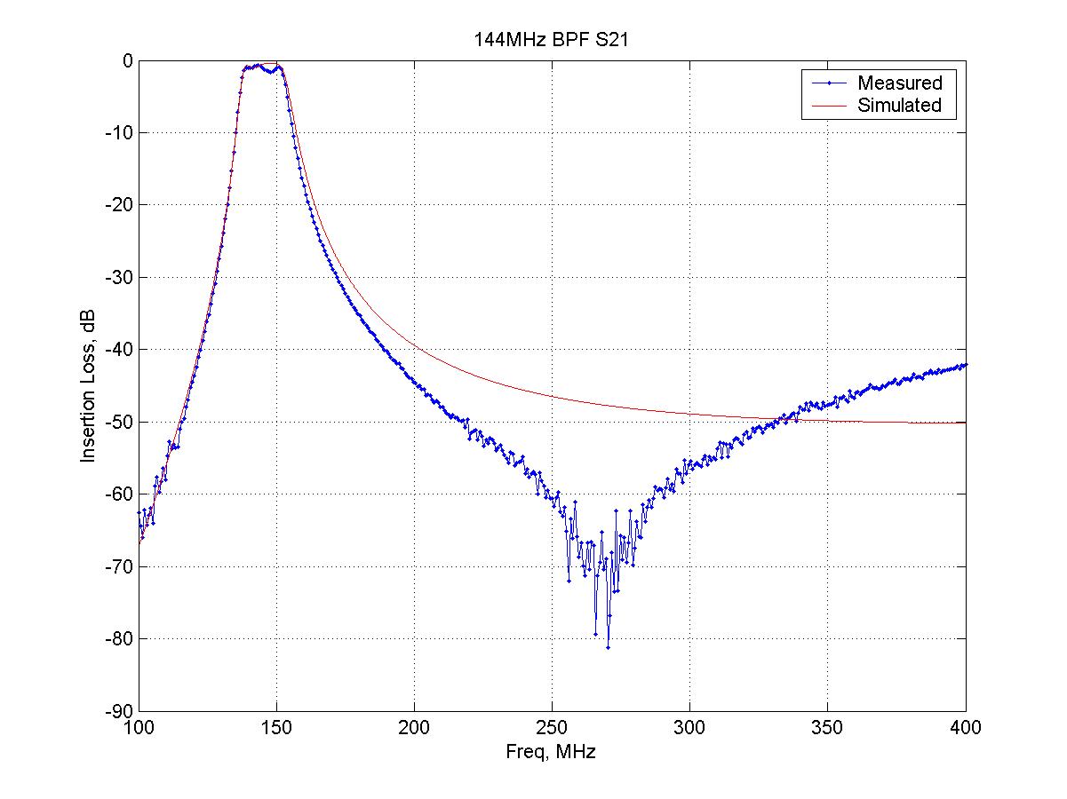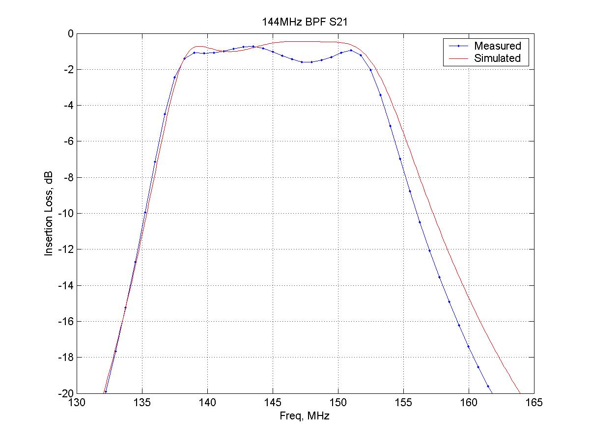 - The design frequency of 144MHz is set by the bandpass filter (a 7 pole Chebyschev design). I chose this frequency not only due to my interest in 144MHz EME, but also because makes a good compromise frequency for designing and building filters and detectors. Also, I have some capacitors on hand which suited the design.
