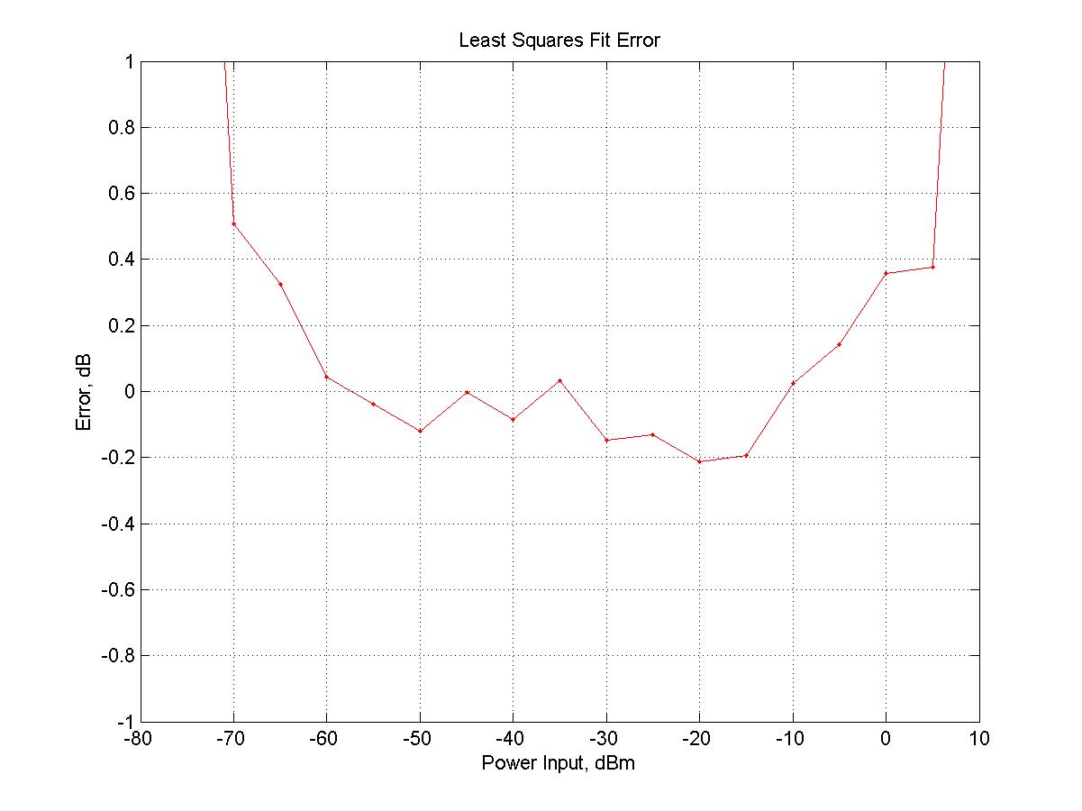 From the measurements shown, it may be seen that for input powers greater than -60dBm and less than -5dBm, the error is better than +-0.2dB. This is an adequate accuracy for the measurements I am undertaking.